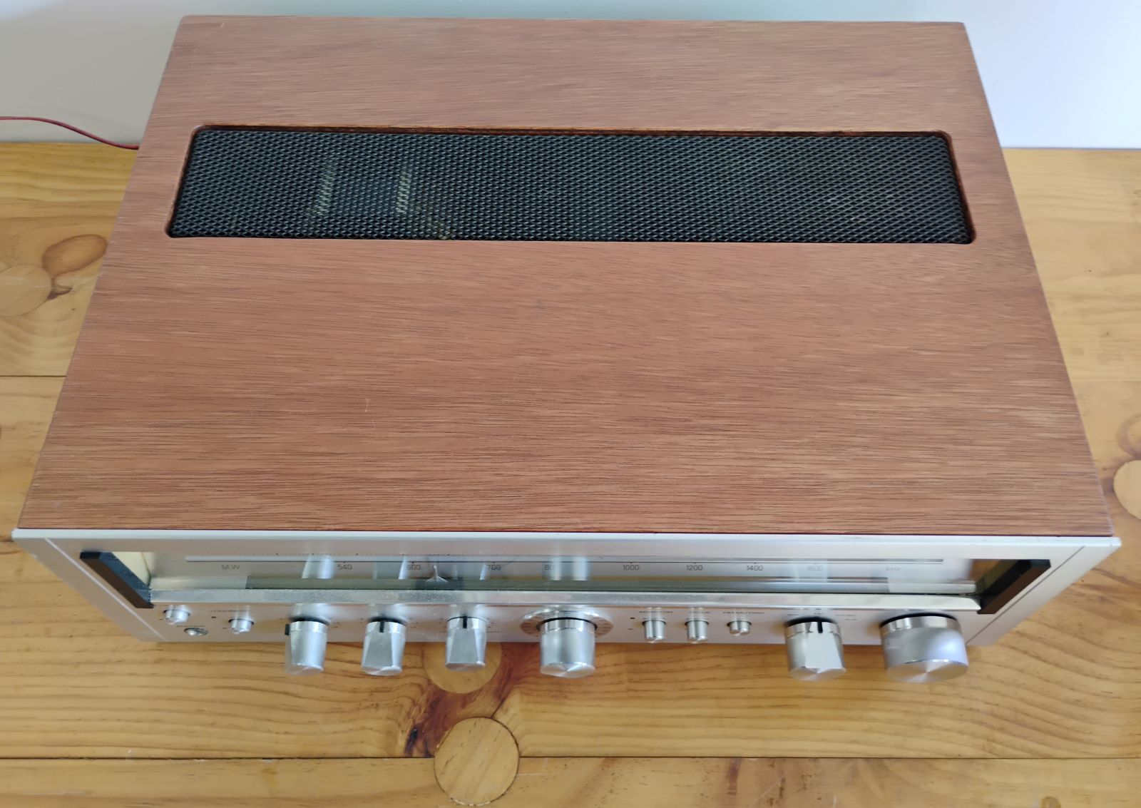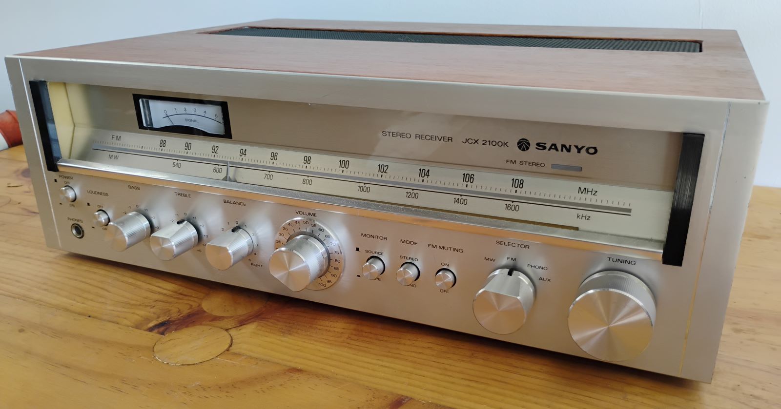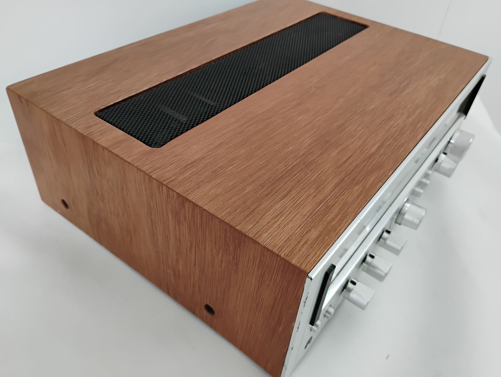 Classic smaller wattage vintage hifi receiver in wood and silver. If you want good looks and don’t need massive power, the Sanyo delivers 1970s looks with beautiful detailed sound. Drives one set of speakers and selection of four inputs, from the onboard AM/FM tuner, to Aux, Phono and Tape. So, this will accept all your modern devices including streamer, phone and DVD/CD player.